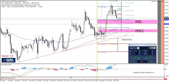 If the market is bullish the first POC 150.18-150.50 and/or the POC2 149.50-75 could spike the price up towards 152.20 but we need to watch all camarilla pivots in between. Because the hike has already beenpriced in, a no hike or dovish monetary outlook/statement could break the W L1/ trendline at 148.97 targeting 148.50 and 147.80. The risk on this event is high.