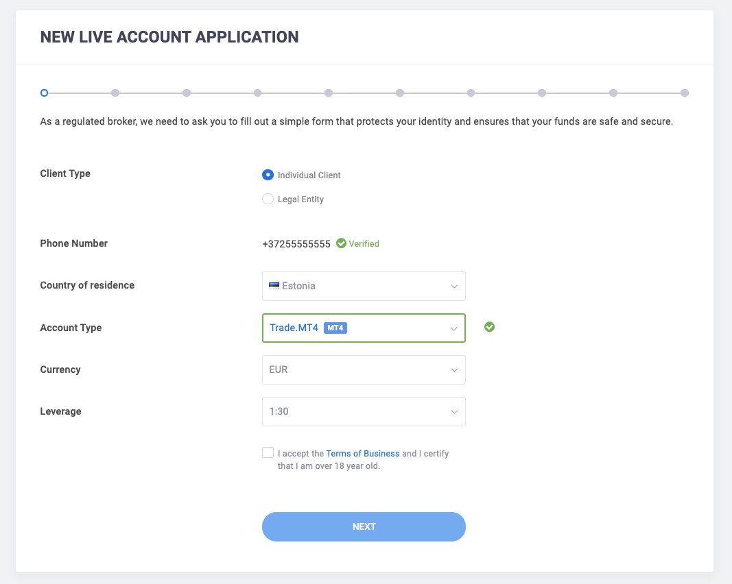 نظرًا لأن التداول التجريبي هو تقريبًا مماثل لتداول حقيقي ، يجب عليك إعداد حسابك بنفس الطريقة التي كنت تعمل بها لدى فتح حساب حقيقي. اختر الإعدادات التي تفضلها ، مثل نوع الحساب والعملة والرافعة المالية.