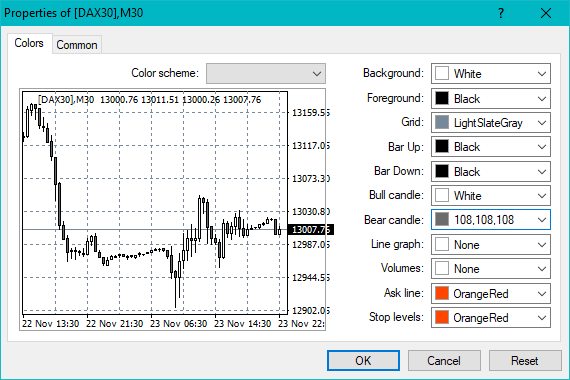 You can now adjust the colours of DAX30, by right-clicking on Properties.