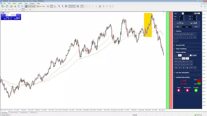 Source: Admirals MT5 Edition Suprême - WTI, graphique journalier - 25 Mai 2017 - 11 Novembre 2018 - Enregistré le 11 Novembre 2018 à 7:52 PM GMT - Veuillez noter: les performances passées n'indiquent pas des performances futures et ne constituent pas non plus un indicateur fiable des performances futures.