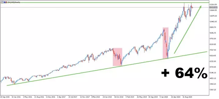 Como é possível ver no gráfico do Índice Nasdaq (US100), este índice está numa tendência de alta a longo prazo.