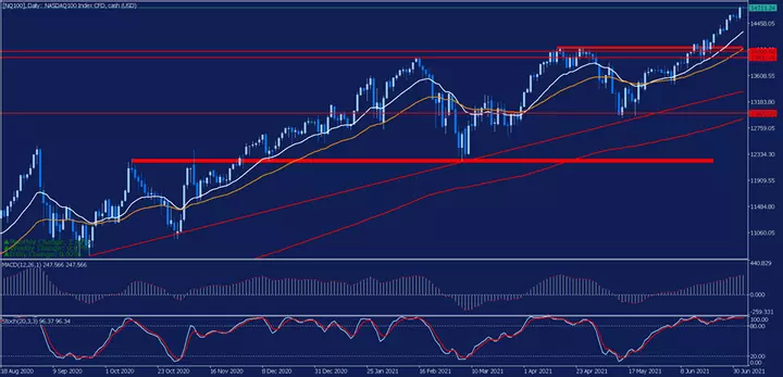 Если взглянуть на дневной график, можно увидеть, что после того, как 22 июня цена преодолела предыдущий уровень сопротивления, который теперь выступает в качестве основного уровня поддержки (красная полоса, близкой к 14000 пунктам), US100 установил новые исторические максимумы.